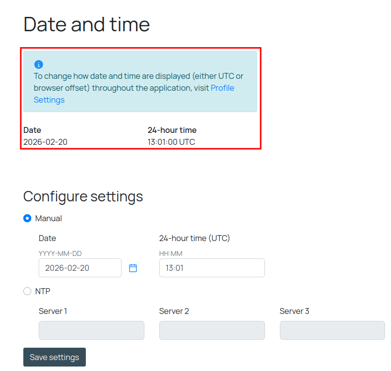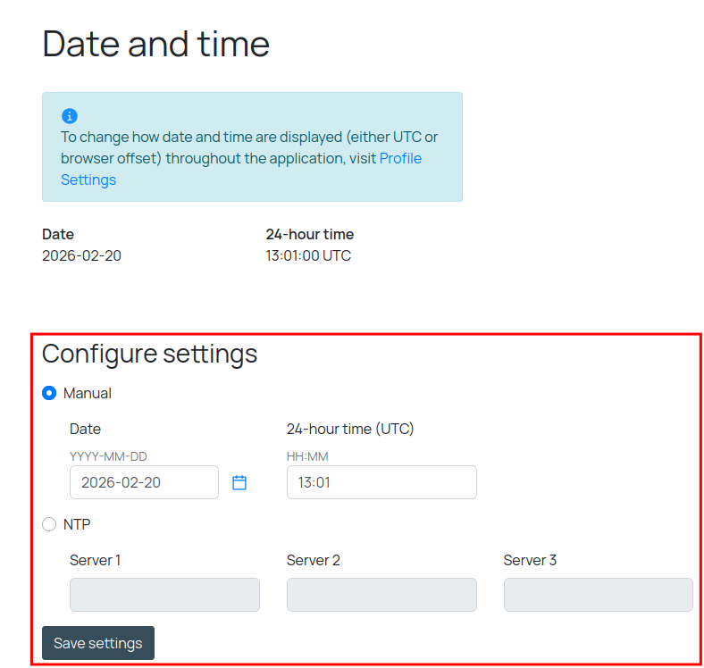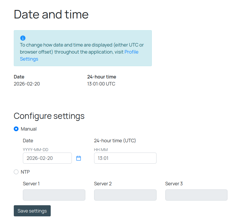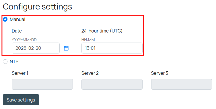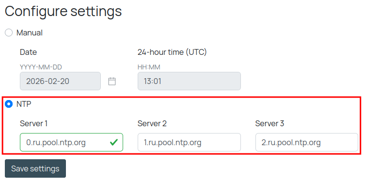 - (Опционально) Введите адрес NTP сервера в формы Server 2 и Server 3.